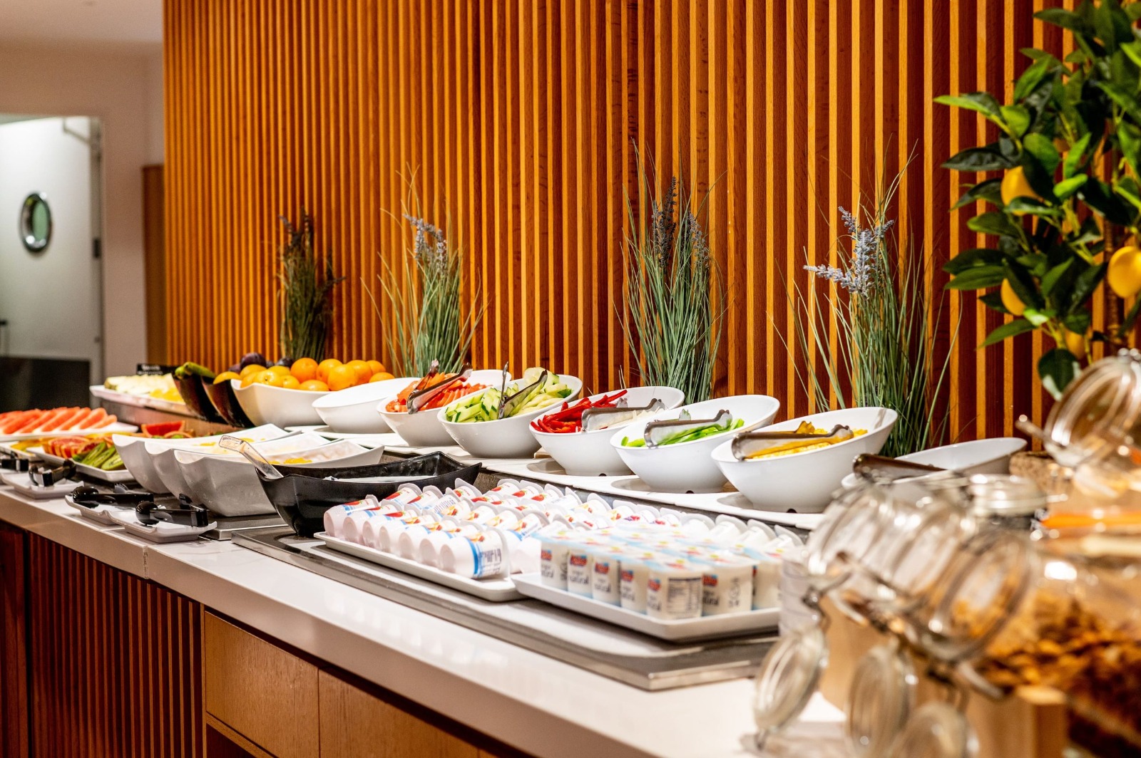 El buffet ofrece una selección de alimentos frescos: frutas tropicales, zumos naturales, repostería, opciones saludables y productos locales.